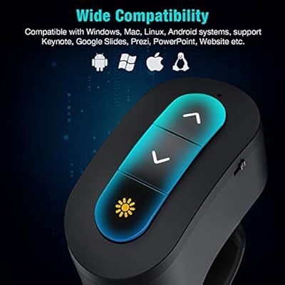 • 【REMOTE CONTROL&DIRECTIONLESS TILIMIT】:Use 2.4G RF imported chip, no need to point into laser pointer for presentations receiver when using wireless presenter,360 degrees free control without direction limit, you will be able to control your presentation with no interference. Laser pointer presentation remote control distance range up to 50 feet, so you are free to move around the room and interact with your audience • 【COMPATIBILIT&SYSTEMS】: Presentation remote control support options: MS Word, Excel, PowerPoint, ACD See, website, iWork (Keynote & Numbers & Pages),Google Slides, Prezi,etc Powerpoint wireless remote is compatible with USB1.1,USB2.0,USB3.0;Support OS: Windows7/8/10/2000/XP,MAC OS,Linux,Google Slides, keynote and Super Hyperlinks; 3 YEAR WARRANTY & FREE USB DONGLE IF LOST WITHIN 2 YEARS-for your peace of mind.